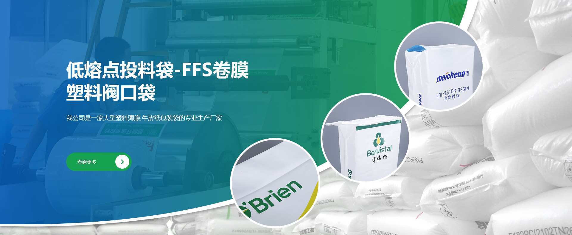 我公司是一家大型集塑料薄膜類(lèi)、牛皮紙類(lèi)產(chǎn)品研發(fā)、生產(chǎn)和銷(xiāo)售的專(zhuān)業(yè)廠(chǎng)家,公司產(chǎn)品大量出口國(guó)外。海陽(yáng)市融昌塑編包裝有限公司創(chuàng)建于1998年,是專(zhuān)業(yè)研發(fā)、生產(chǎn)和銷(xiāo)售低熔點(diǎn)橡膠投料袋、EVA閥口袋、LDPE多層閥口袋、EVA/LDPE低熔點(diǎn)膜、橡膠包裝膜、FFS重包裝袋、普通塑料包裝袋、牛皮紙閥口袋等產(chǎn)品的綜合包裝類(lèi)企業(yè)。公司坐落于中國(guó).山東省煙臺(tái)海陽(yáng)市,地處黃海之濱,位于青島、煙臺(tái)、威海三市的中心地帶,交通發(fā)達(dá)占地面積35000㎡,固定資產(chǎn)8000萬(wàn)...